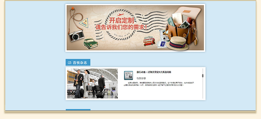 Project Description 百悦逸游于2012年初由二位资深的旅行家创办,是成都传媒集团旗下成都新闻国际旅行社有限公司的高端旅游品牌,总部位于成都高新区天府大道中段美年广场。在百悦逸游成立之前,创始团队亲自到全球三十多个国家实地考察,带着第一手的资讯和执着的信念创立了中国西部第一家真正意义上的私人定制旅行机构。百悦的旅行不是跟团挤大巴,不是十天去十个国家,更不是没完没了的... Official website address 自贡http://www.100.travel I want to share